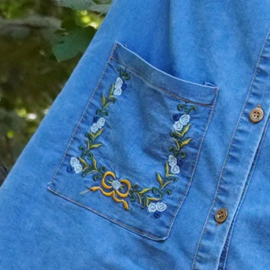مانتو جین کاغذی جلو باز که با دکمه بسته می شود. یک جیب درقسمت چپ دارد و روی جیب و دور مچ گلدوزی شده است. گلدوزی در دو رنگ صورتی و آبی است. مچ دکمه دارد و یقه شکاری دارد. سایز بندی 2-3-4 از 9 سال تا 17 سال مناسب است. سایز 4 هماهنگ با سایز 38 است.